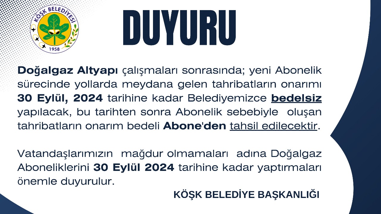 Konuyla ilgili Köşk Belediyesi tarafından yapılan duyuruda; “Doğalgaz Altyapı çalışmaları sonrasında; yeni Abonelik sürecinde yollarda meydana gelen tahribatların onarımı 30 Eylül, 2024 tarihine kadar Belediyemizce bedelsiz yapılacak, bu tarihten sonra Abonelik sebebiyle oluşan tahribatların onarım bedeli Abone’den tahsil edilecektir. Vatandaşlarımızın mağdur olmamaları adına Doğalgaz Aboneliklerini 30 Eylül 2024 tarihine kadar yaptırmaları önemle duyurulur.” ifadeleri yer aldı.
